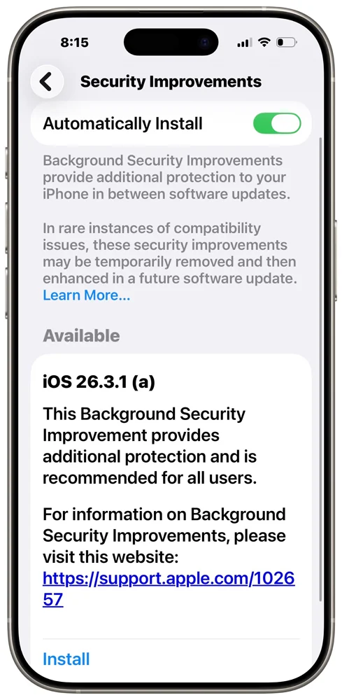Компания Apple впервые запустила новый механизм защиты — так называемые Background Security Improvements (фоновые обновления безопасности). Это отдельный тип патчей, который устанавливается без полноценного обновления системы.