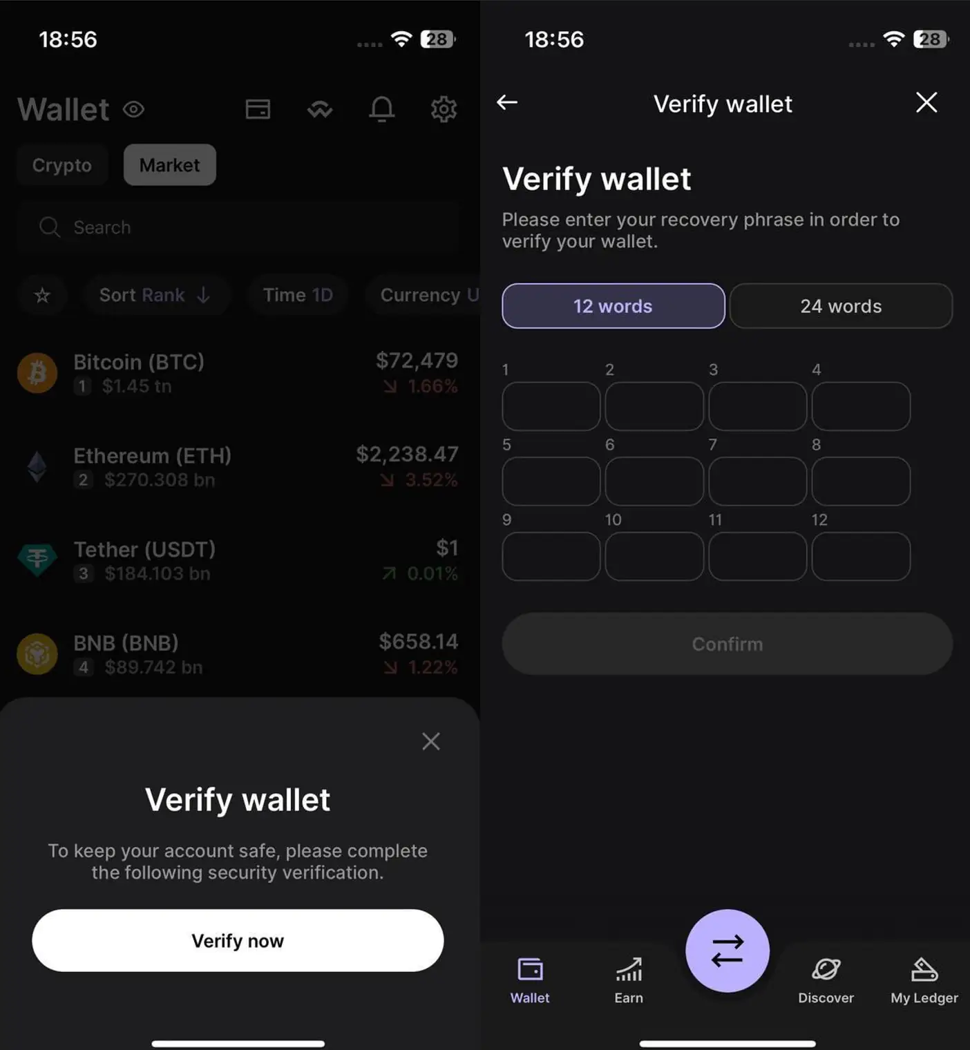 В случае с аппаратными кошельками, такими как Ledger, злоумышленники используют фишинговые запросы в приложении, чтобы обманом заставить пользователей вручную вводить начальные фразы на поддельных экранах проверки безопасности.