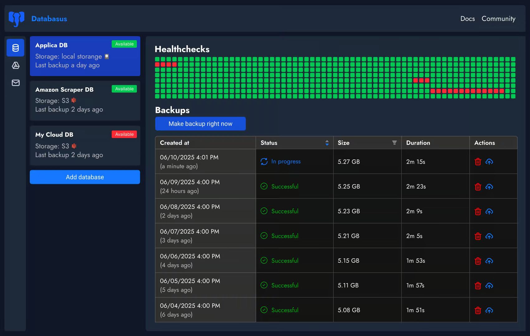 Всё это привело к тому, что недавно разработчики решили официально переименовать инструмент с Postgresus на Databasus. Юридические аспекты также сыграли свою роль, поскольку термин «Postgres» является зарегистрированным товарным знаком компании PostgreSQL Inc., и его дальнейшее использование в названии проекта могло привести к риску нарушения прав на товарный знак. Наконец, по словам разработчиков, в планах есть и поддержка других движков баз данных.