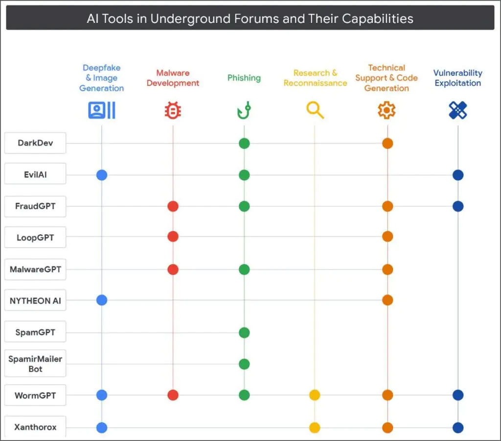 Предложения варьируются от утилит для создания дипфейков и изображений до разработки вредоносного ПО, фишинга, исследований и разведки, а также использования уязвимостей.