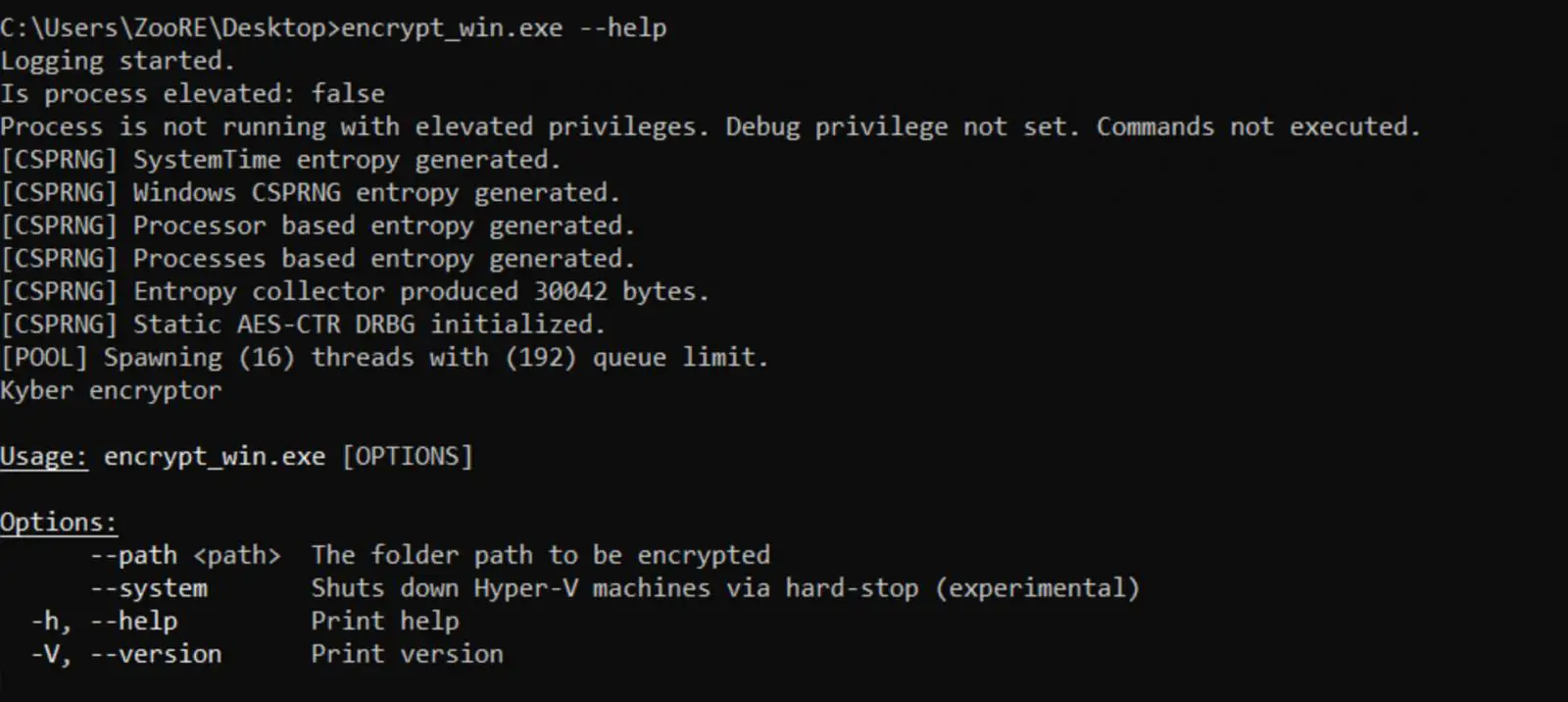 Версия для Windows, написанная на языке Rust, использует Kyber1024 и X25519 для защиты ключей, что соответствует требованиям, указанным в записке с требованием выкупа.