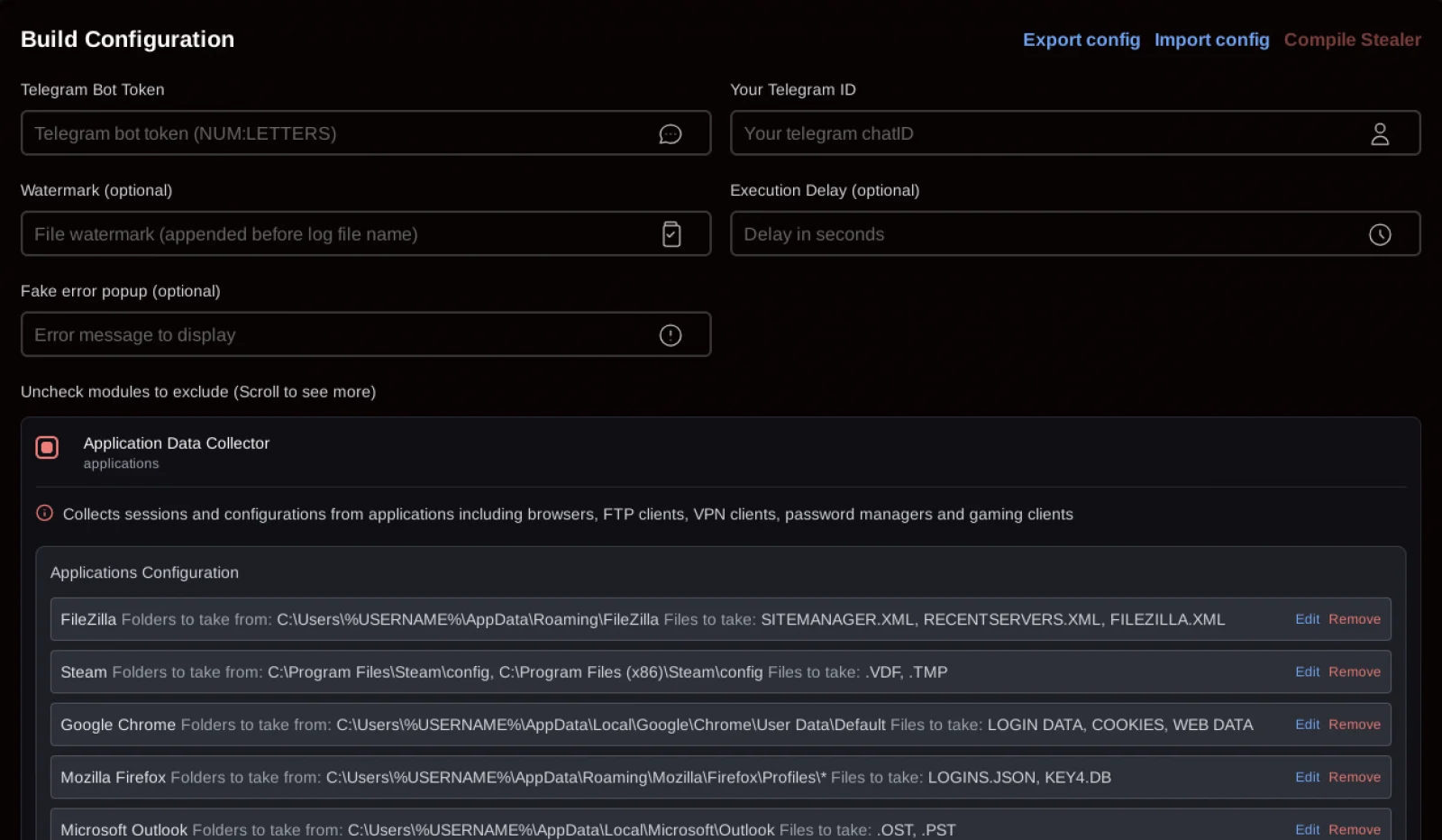 Панель имеет удобный интерфейс, с помощью которого «клиенты» могут настраивать свои сборки с учетом конкретных областей таргетинга — от полномасштабной кражи данных до сбора только определенных данных.