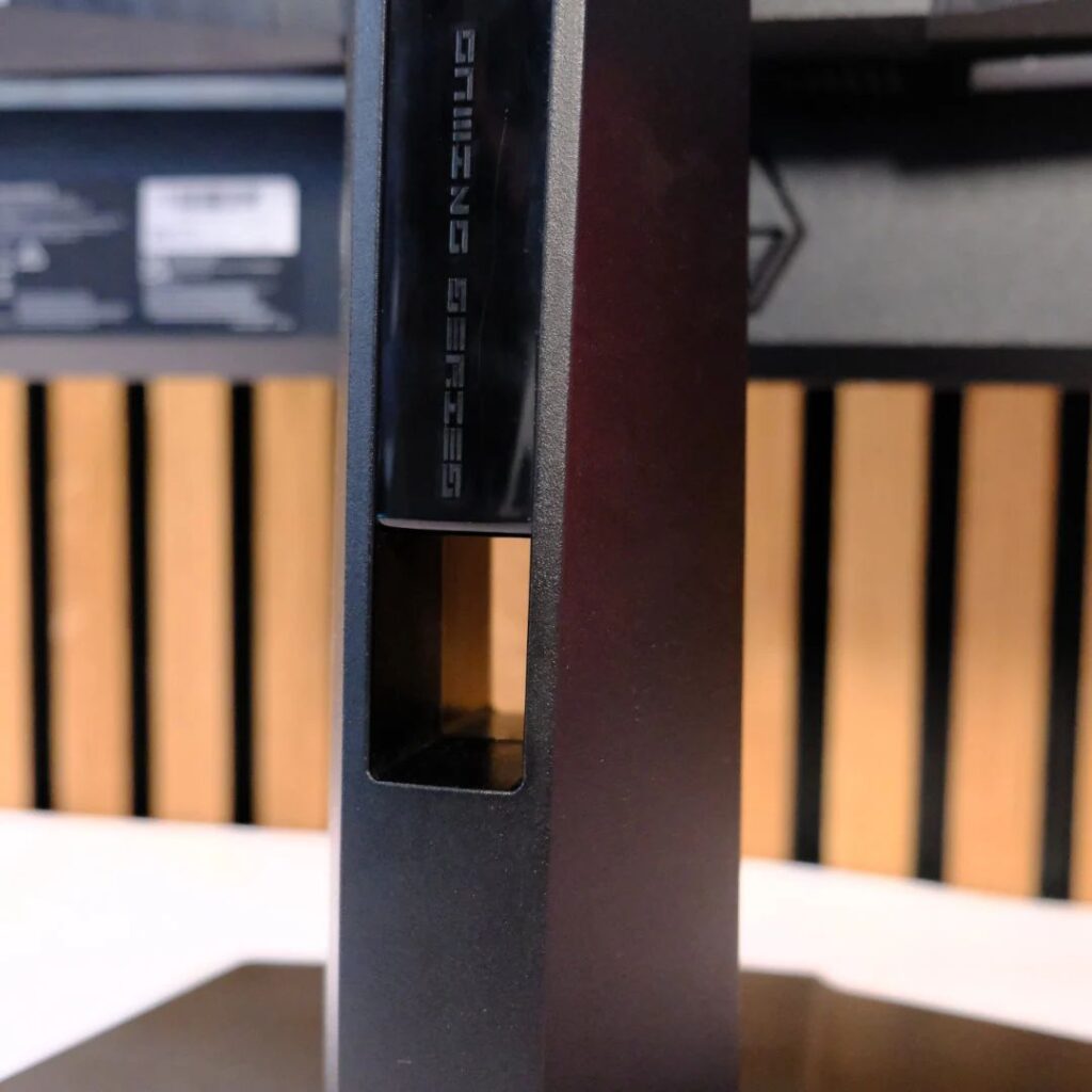 Прокладка кабелей через подставку позволяет сохранить порядок, не прибегая к чрезмерным усилиям, хотя здесь есть над чем поработать. Как и в предыдущей модели, вы можете заметить, что более толстые провода изгибаются под подбородком, когда достигают выреза. И снова в центре подставки нет углубления, а это значит, что кабели клавиатуры и мыши придётся либо прокладывать по ножке, как навязчивую лозу, либо обматывать вокруг неё. К счастью, основание с одной пластиной довольно компактное, что позволяет свести к минимуму количество растягивающихся проводов, при этом не страдают два выступающих упора, которые есть у многих конкурентов.
