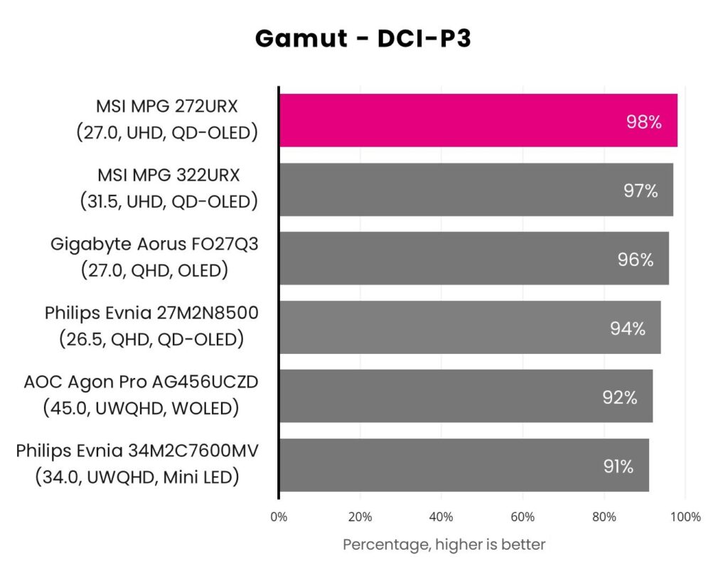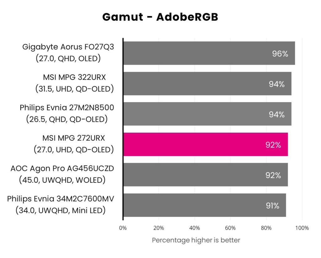 Неудивительно, что цветовая гамма соответствует другим моделям MSI и охватывает 92 % AdobeRGB и целых 98 % DCI-P3. С какой стороны ни посмотри, MPG 272URX — это нечто потрясающее.
