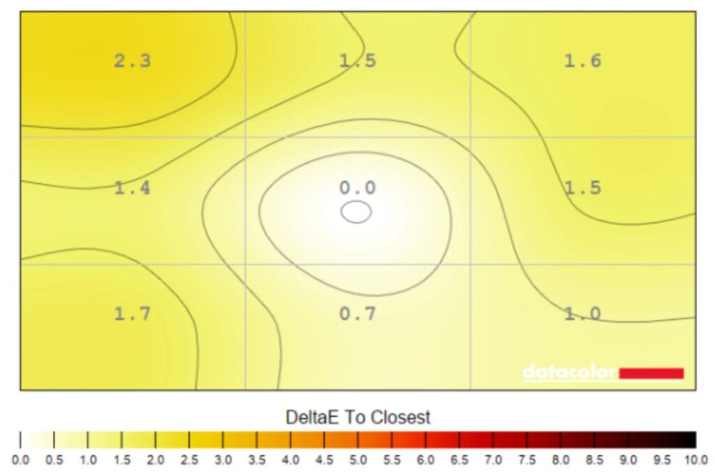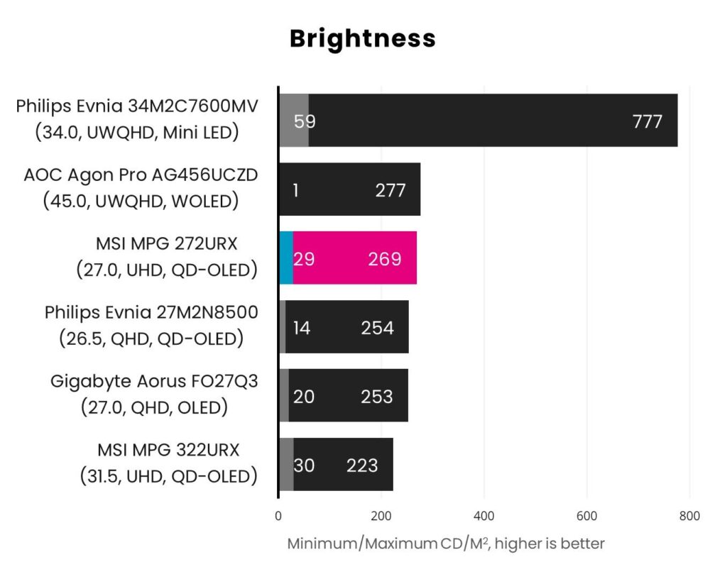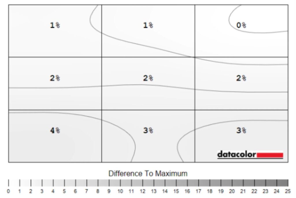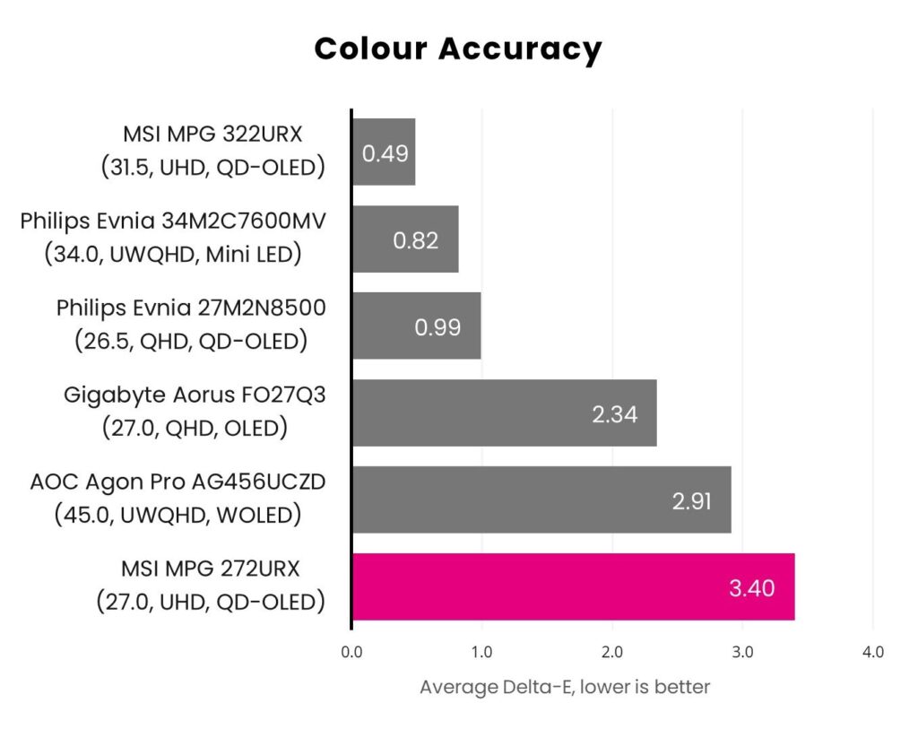 MSI MPG 272URX может похвастаться фантастической однородностью изображения от края до края, значительно превосходя наши 10-процентные пороговые значения. Отклонение яркости составляет не более 4 % без видимых дефектов, а отклонение цвета — не более 2 %. Это неудивительно, учитывая, что OLED-дисплеи являются лучшими из протестированных нами панелей, но всё же стоит отдать должное.