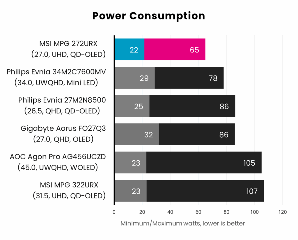 Несмотря на то, что MSI MPG 272URX заметно ярче своего 32-дюймового аналога, его энергопотребление для OLED-дисплея составляет всего 65 Вт под нагрузкой. Это значение может немного увеличиться, если вы будете смотреть HDR-контент, но в среднем оно будет гораздо ниже — около 40 Вт, поскольку пиксели то излучают свет, то полностью отключаются.