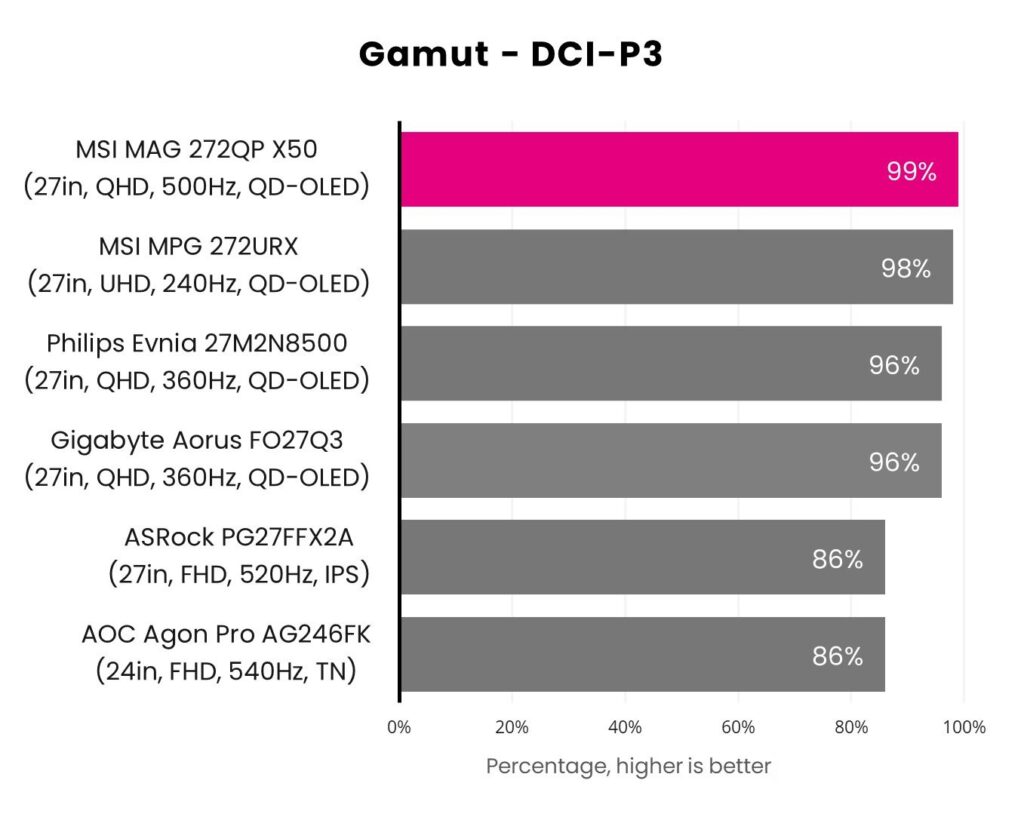 Согласно отчёту о калибровке, прилагаемому компанией MSI, MAG 272QP X50 покрывает 99 % цветового пространства DCI-P3. Такой результат делает этот монитор одним из лучших в этом отношении, которые мы когда-либо тестировали, а также лучшим из недавно выпущенных аналогичных дисплеев, представленных в таблицах выше.