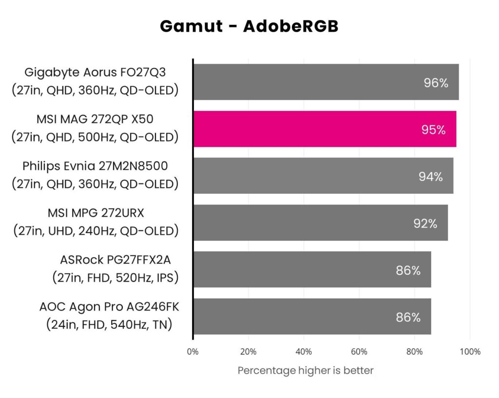 Если смотреть шире, то MAG 272QP X50 также способен отображать 95 % цветовой гаммы AdobeRGB. Это важнее для творческих процессов, таких как графический дизайн и фотография, чем для игр. Несмотря на то, что этот монитор в первую очередь предназначен для игр, он доказал, что может использоваться и как более профессиональная панель.