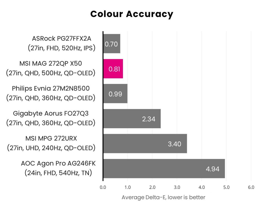 MAG 272QP X50 обеспечивает исключительно точную цветопередачу со средним показателем Delta-E 0,81. В худшем случае показатель Delta-E достигает почти незаметных 2,49.