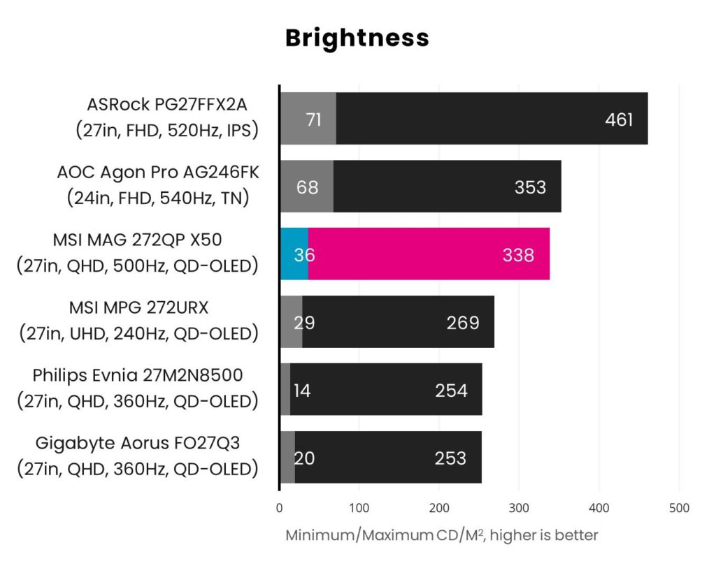 Яркость MAG 272QP X50 достигает 338 нит, что намного приятнее для глаз, чем у старых OLED-мониторов. В частности, эта модель на целых 22 % ярче предыдущей лучшей модели, которую мы видели, а именно 277 нит у Agon Pro AG456UCZD.