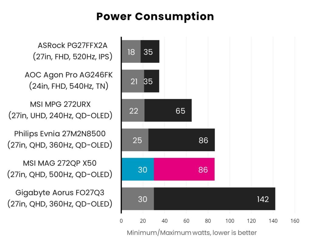 Более высокое энергопотребление — неизбежный недостаток всех QD-OLED-дисплеев по сравнению с ЖК-дисплеями. Однако MAG 272QP X50 остаётся относительно экономичным, учитывая его характеристики, и не уступает Evnia 27M2N8500, несмотря на дополнительные 140 герц.