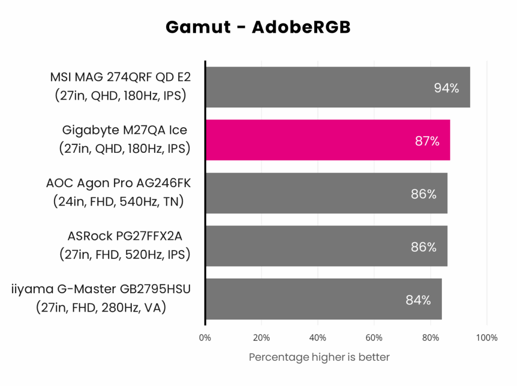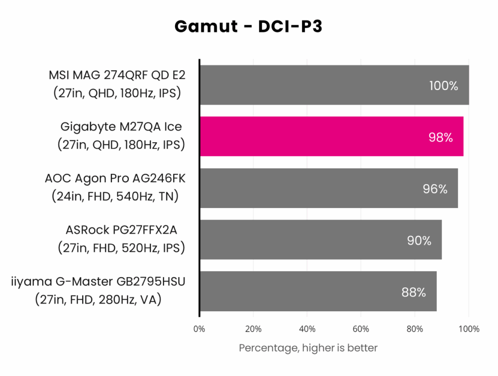 Покрытие цветовой гаммы примерно такое же, как у панели с подсветкой, но без слоя квантовых точек. Если точнее, M27QA Ice покрывает 87 % пространства AdobeRGB и 98 % пространства DCI-P3.
