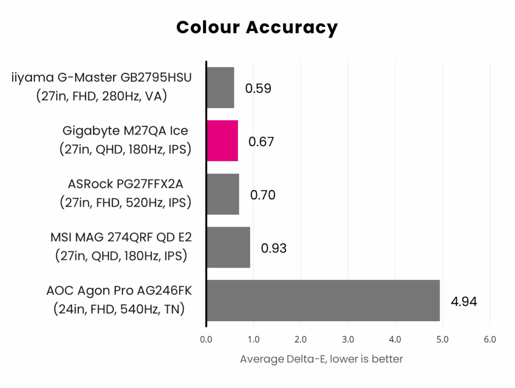 Как человек, который тщательно следит за точной цветопередачей, я рад, что в таком бюджетном мониторе уделено этому внимание. С помощью нескольких небольших настроек, позволяющих добиться максимального значения Delta-E, вы можете даже с уверенностью использовать M27QA Ice для некоторых профессиональных задач.