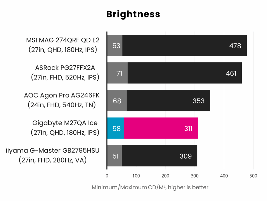 Даже без нашего Datacolor SpyderPro было очевидно, что M27QA Ice — не самый яркий монитор. С пиковой яркостью 311 нит он сильно отстаёт от других IPS-панелей, которые обычно имеют яркость около 450 нит+, и фактически ближе к VA-панелям, таким как iiyama G-Master GB2795HSU.