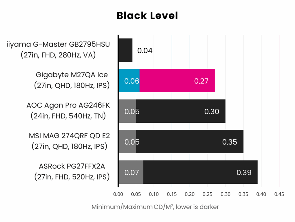 Подсветка без зон затемнения по своей сути приводит к повышению уровня чёрного, но M27QA Ice, что впечатляет, практически не осветляет тёмные сцены. Максимальное значение составляет 0,27 кд/м2, и это второй лучший результат, который мы видели для IPS-матриц, уступающий только ASRock PG27QFT2A.