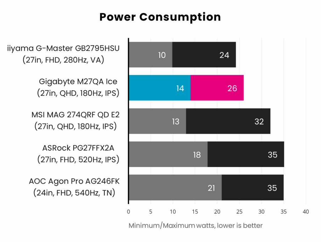 Диапазон энергопотребления M27QA Ice составляет 14–26 Вт, что делает его одним из самых экономичных дисплеев с подсветкой. Эти значения относятся к монитору с одним системным подключением через DisplayPort и USB-B.