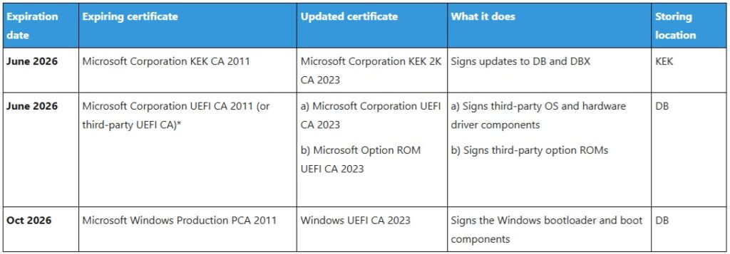 Первые сертификаты действительны в течение 15 лет, и они были выпущены в 2011 году, что означает, что срок их действия очень близок. Microsoft подтвердила, что срок действия таких сертификатов истекает в июне 2026 года (https://techcommunity.microsoft.com/blog/windows-itpro-blog/act-now-secure-boot-certificates-expire-in-june-2026/4426856), выпустила уведомление для пользователей Windows, чтобы они знали об этой проблеме, и обновила свою страницу вопросов и ответов, чтобы лучше помогать пользователям Windows.