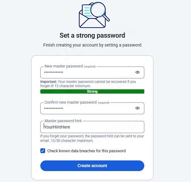 Затем добавьте свой мастер-пароль и подсказку к нему.