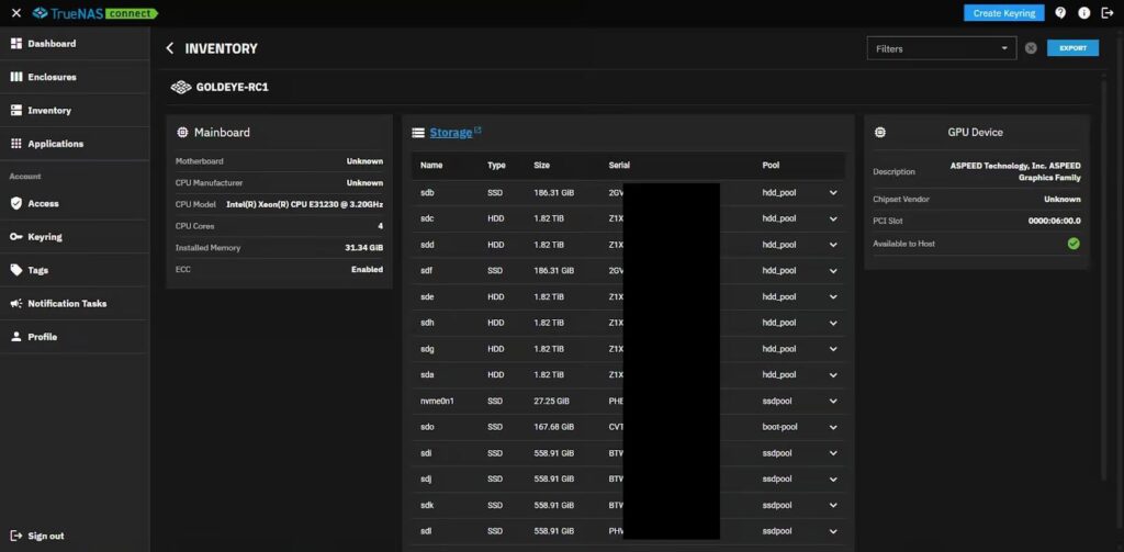 Кроме того, TrueNAS Connect предоставляет инструменты для управления инвентаризацией, позволяющие пользователям отслеживать аппаратные средства, создавать отчёты и экспортировать данные в формате CSV или JSON. Функция отображения корпусов обеспечивает визуальное представление дисков и пулов, что позволяет администраторам быстро определять состояние дисков или выявлять неисправности.