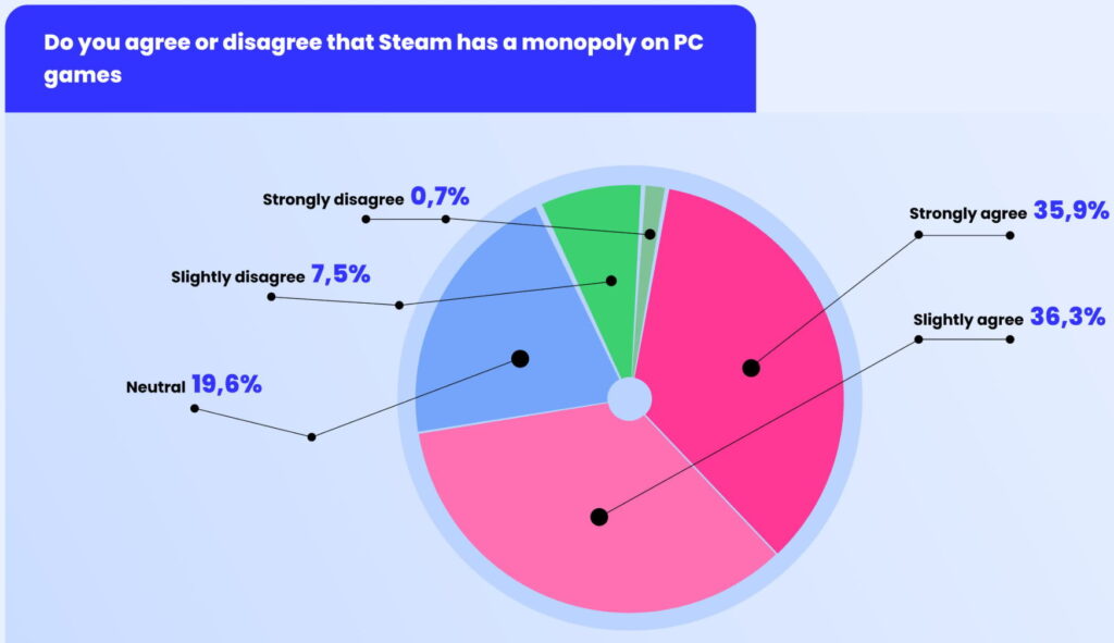 Опрос, проведенный среди более чем 300 руководителей крупных американских и британских компаний, занимающихся производством видеоигр, попытался прояснить этот вопрос. 72% разработчиков сочли, что в большей или меньшей степени Steam является де-факто монополистом, но он также приносит им львиную долю доходов. 88% респондентов объяснили, что три четверти их доходов поступает от Steam, и даже 37% указали, что на эту платформу приходится 90% их общего дохода.
