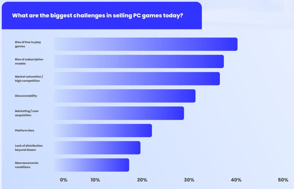 Разработчики также ответили на вопросы об основных проблемах рынка ПК, при этом треть упомянула насыщенность рынка и трудности с поиском новых игр, что согласуется с данными, свидетельствующими о том, что игроков недостаточно для тысячи новых игр, выпускаемых в Steam каждый год. Аналогичная доля респондентов также выразила обеспокоенность по поводу услуг подписки, что неоднократно повторялось среди разработчиков, поскольку, по их мнению, как и в случае с Microsoft Game Pass, они наносят ущерб отрасли.