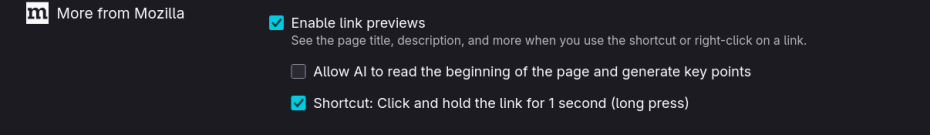 Еще одной новой функцией в предстоящем выпуске Firefox 146 является поддержка предварительного просмотра ссылок (включена по умолчанию в разделе «Общие» > «Настройки браузера») с помощью сочетания клавиш или щелчка правой кнопкой мыши по ссылке с возможностью использования искусственного интеллекта для чтения начала страницы и генерации ключевых моментов, однако функция с поддержкой искусственного интеллекта по умолчанию не включена.