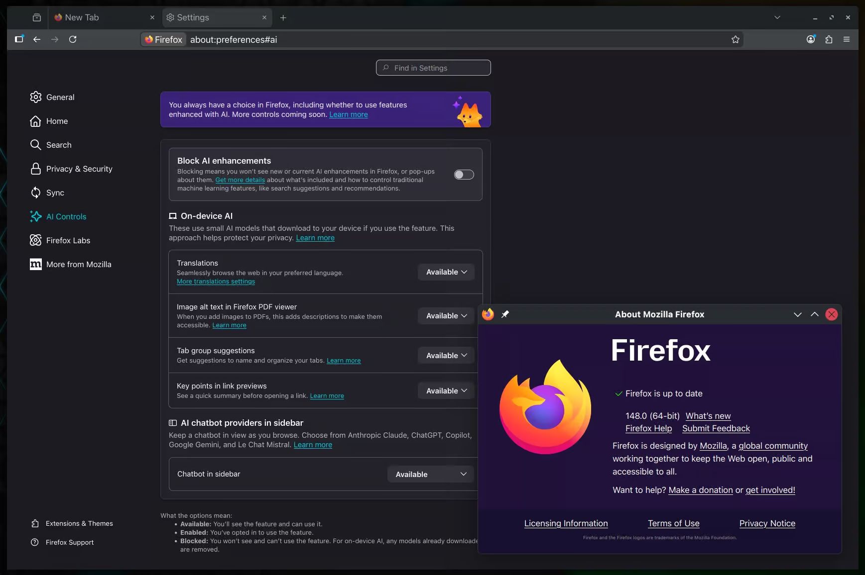 С помощью видимого переключателя «Отключить улучшения на основе ИИ» пользователи могут отключить как новые, так и уже существующие функции на основе ИИ. По умолчанию улучшения на основе ИИ заблокированы, но при желании пользователи могут включить отдельные функции. Mozilla сообщает, что в будущих обновлениях будут добавлены дополнительные элементы управления ИИ.