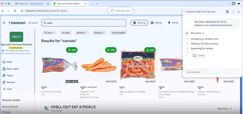 Мы говорим об «агенте по использованию», которому вы можете задавать сложные и повторяющиеся задачи, такие как «записаться на прием для стрижки на следующей неделе во второй половине дня» или «закажите еженедельную покупку с помощью этих продуктов». После получения команды агент Chrome будет управлять курсором и просматривать веб-страницы, необходимые для выполнения задачи, как вы можете видеть в демоверсии, опубликованной Google.