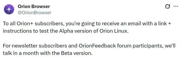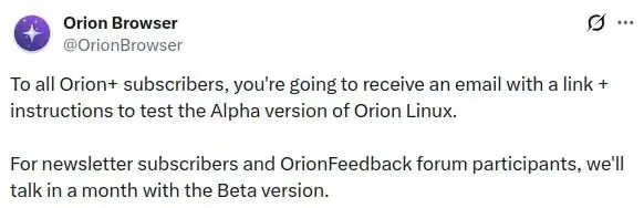 Однако, если вы хотите сразу протестировать браузер, вам придётся подождать, поскольку доступ к сборке для Linux будет предоставляться поэтапно. Сначала подписчики Orion+ получат электронное письмо со ссылкой для скачивания и инструкциями по тестированию альфа-версии Orion для Linux, что позволит им получить ранний практический доступ.