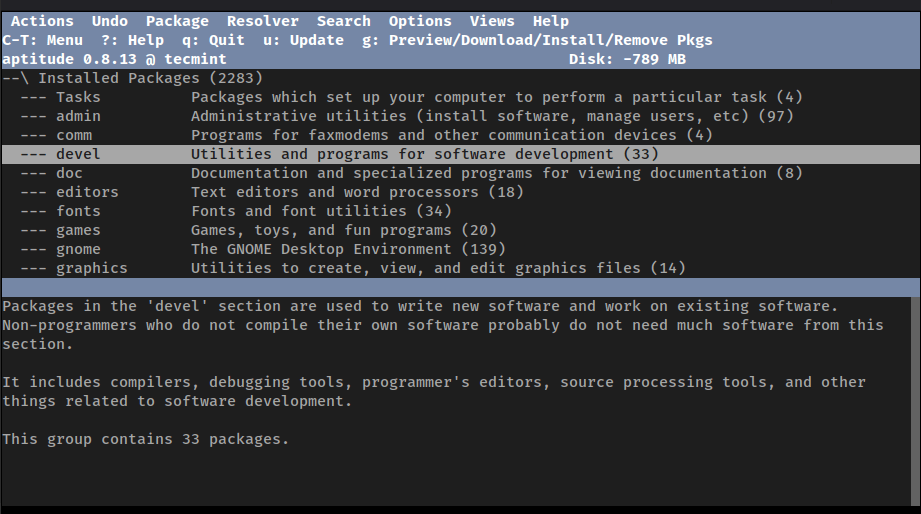 Однако одним из ключевых преимуществ aptitude является наличие интерактивного текстового интерфейса, который можно открыть с помощью: