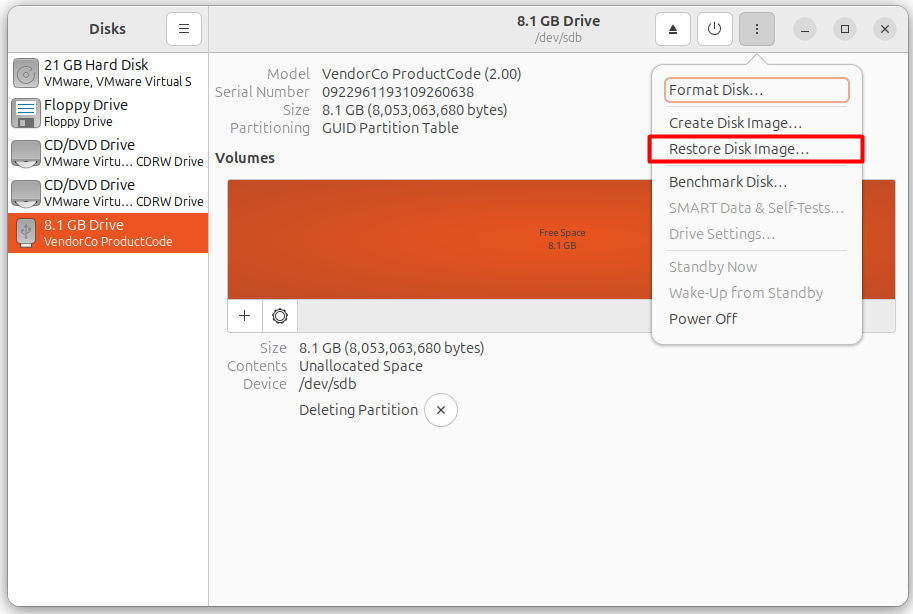 Подключите USB-накопитель с ОС Linux и откройте приложение «GNOME Disks». Теперь выберите USB-накопитель и нажмите «вертикальное многоточие».