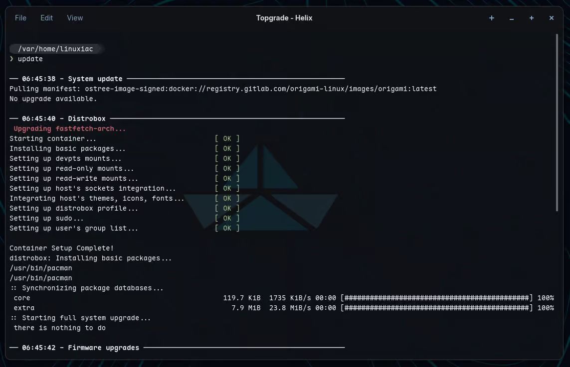 Дистрибутив также включает в себя автоматические фоновые обновления, запускаемые пользовательским таймером systemd, а также возможность ручного обновления образа системы, приложений Flatpak и контейнеров Distrobox. Все эти процессы управляются с помощью удобной команды update на основе Topgrade — унифицированного инструмента для обновления системы, который объединяет эти пути обновления.
