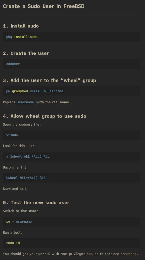 Добавление, удаление и предоставление прав sudo пользователям в FreeBSD 15