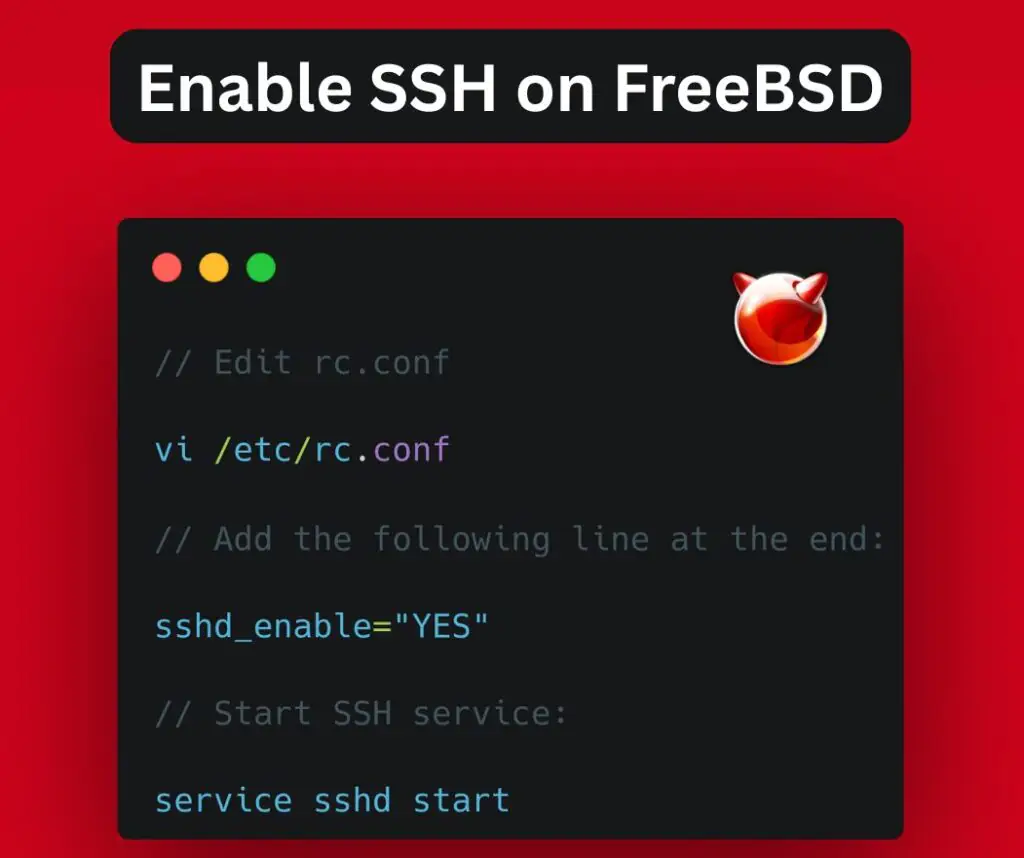 В этой краткой статье описаны шаги по настройке и включению SSH в FreeBSD. Все описанные ниже действия протестированы на только что установленной FreeBSD 15 и более ранних версиях.
