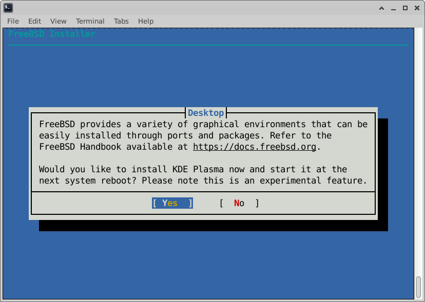 В будущем стандартная bsdinstall программа будет просто спрашивать, нужен ли вам рабочий стол. Если вы ответите «да», система сделает все остальное практически без вашего участия. После перезагрузки вы сразу увидите графический экран входа в KDE.
