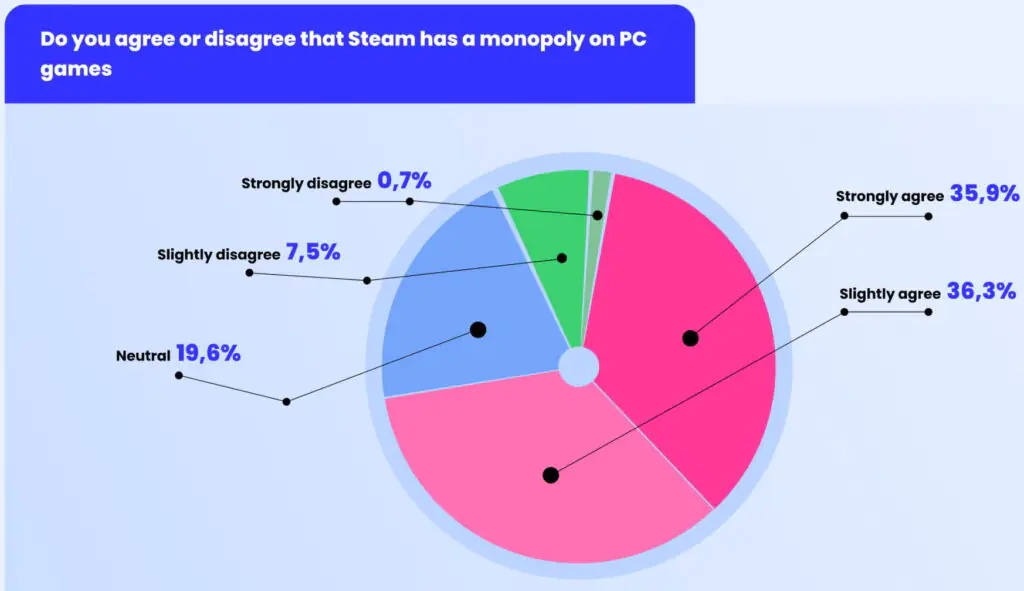 Опрос, проведенный среди более чем 300 руководителей крупных американских и британских компаний, занимающихся производством видеоигр, попытался прояснить этот вопрос. 72% разработчиков сочли, что в большей или меньшей степени Steam является де-факто монополистом, но он также приносит им львиную долю доходов. 88% респондентов объяснили, что три четверти их доходов поступает от Steam, и даже 37% указали, что на эту платформу приходится 90% их общего дохода.