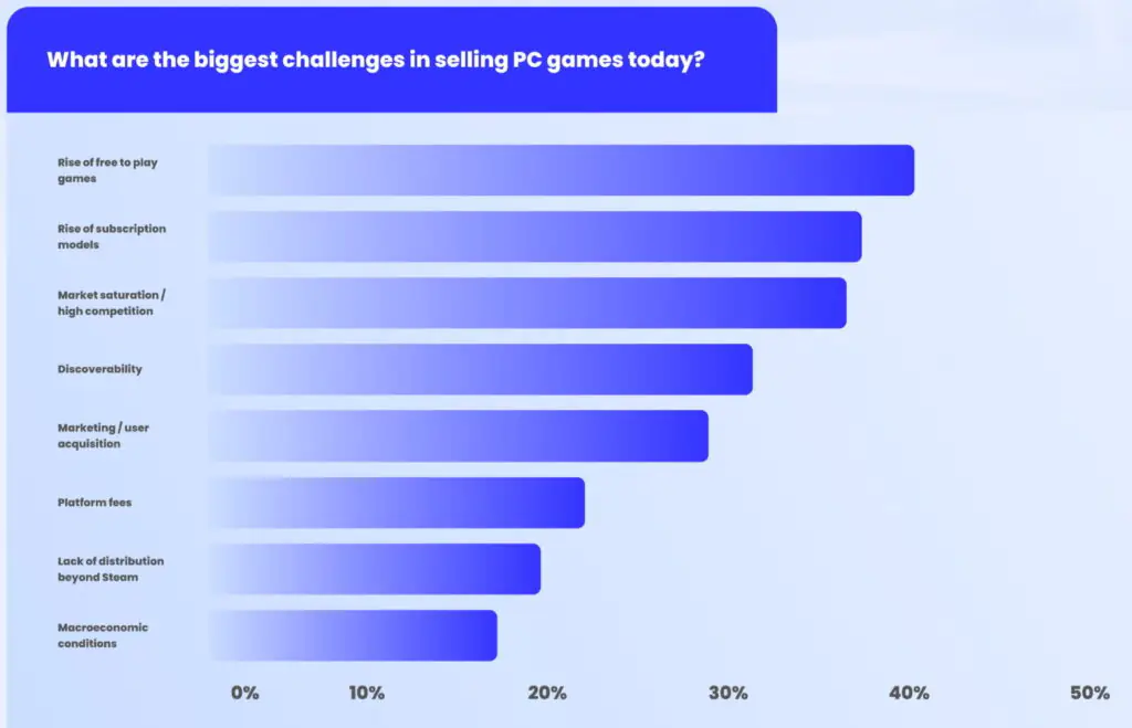 Разработчики также ответили на вопросы об основных проблемах рынка ПК, при этом треть упомянула насыщенность рынка и трудности с поиском новых игр, что согласуется с данными, свидетельствующими о том, что игроков недостаточно для тысячи новых игр, выпускаемых в Steam каждый год. Аналогичная доля респондентов также выразила обеспокоенность по поводу услуг подписки, что неоднократно повторялось среди разработчиков, поскольку, по их мнению, как и в случае с Microsoft Game Pass, они наносят ущерб отрасли.