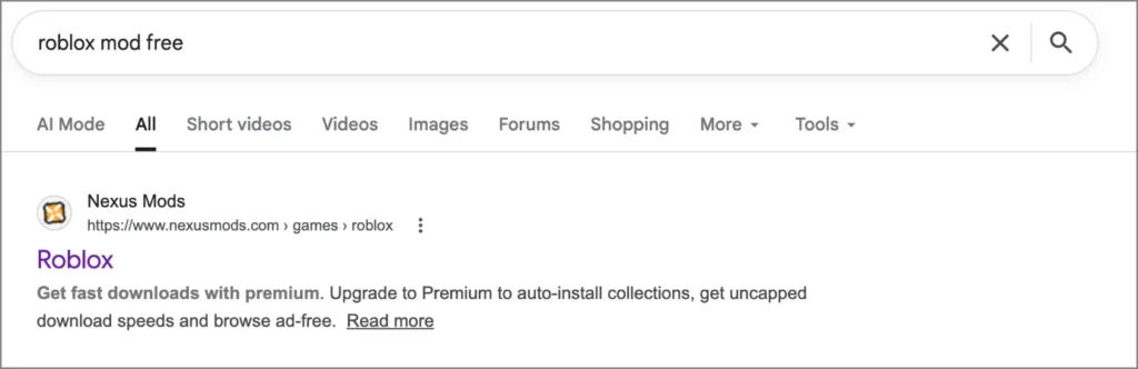 Итак, мы ввели в Google «бесплатный мод для Roblox», и это был первый результат, который мы увидели.