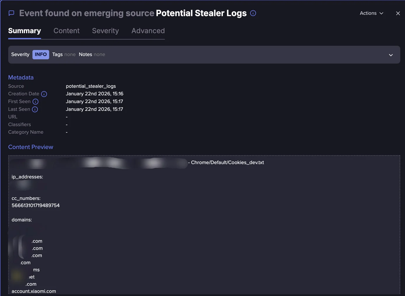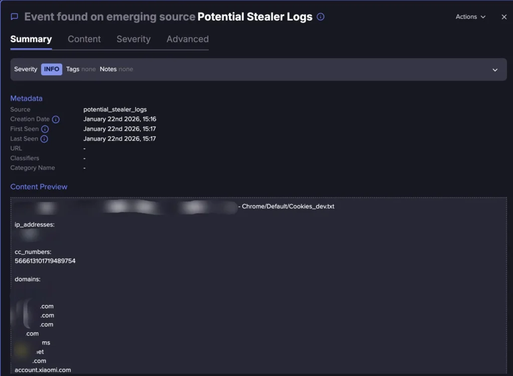 Вы также можете просмотреть сами журналы. Ниже представлена типичная структура журналов, включающая IP-адреса, домены и данные кредитных карт. Кроме того, в них могут содержаться сведения об едином входе (SSO), файлах cookie, токенах, паролях и т. д.