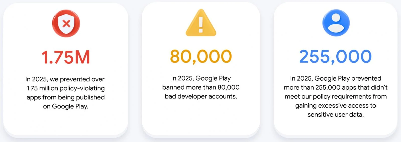 По данным Google, до 2025 года компания заблокировала более 255 000 приложений для Android, которые получали чрезмерный доступ к конфиденциальным данным пользователей, и отклонила более 1,75 миллиона приложений для публикации в Google Play из-за нарушений правил.