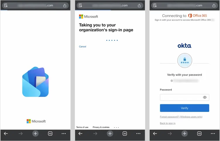 Те, кто проходит проверку, попадают на страницу сбора учетных данных, которая в режиме реального времени имитирует процесс входа в Microsoft, передавая учетные данные и коды многофакторной аутентификации (MFA) в API Microsoft и захватывая токен сеанса.