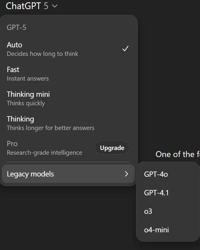 В настоящее время у OpenAI есть несколько моделей GPT-5. По умолчанию используется GPT-5 Auto, которая автоматически переключается между обычной моделью и моделью логического вывода.