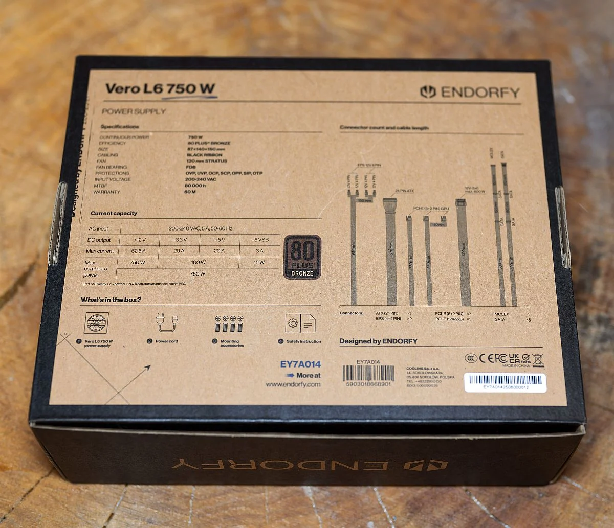 Vero L6 от Endorfy — это привлекательный блок питания ATX 3.1, который отличается надёжной выходной мощностью, высокой пропускной способностью для современных графических процессоров и выгодной ценой в массовом сегменте. Он предназначен для пользователей, которым нужна технически современная платформа (ATX 3.1 + PCIe 5.1 12 В — 2 × 6) без переплаты за флагманские блоки питания. Сертифицированный по стандартам 80 Plus Bronze и Cybenetics Silver, этот немодульный кабель доступен в трёх вариантах мощности: 550 Вт, 650 Вт и 750 Вт, но он не поддерживает полупассивный режим работы.
