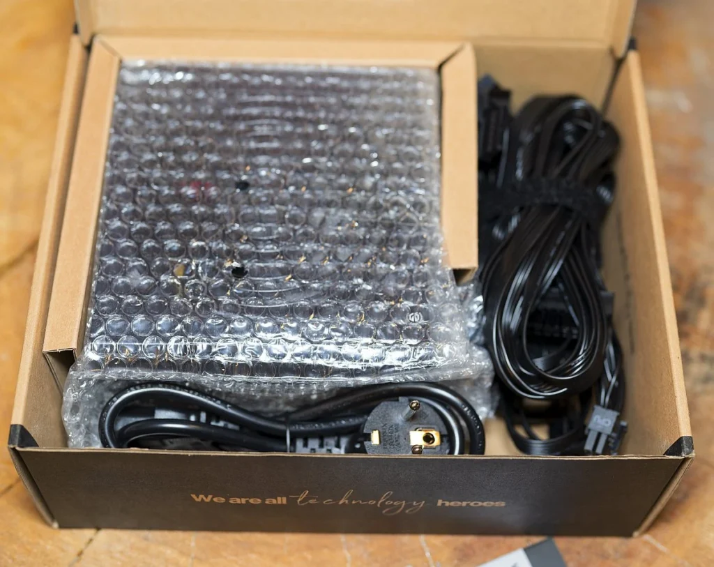 Блок питания поставляется в простой картонной коробке. На лицевой стороне вы найдёте информацию о модели, мощности блока питания, сертификации 80 Plus Bronze (без значка Cybenetics) и изображение блока питания. На обратной стороне вы найдёте дополнительные сведения о технических характеристиках и прилагаемых кабелях, а также всё остальное, что есть в коробке.