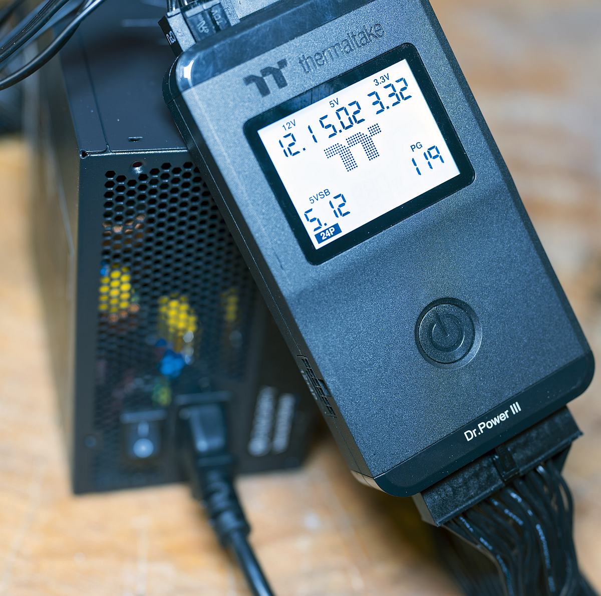 Мой первый базовый тест проводится с помощью тестера блоков питания. Он потребляет от блока питания не более пары ватт, но помогает определить, исправен ли блок питания. Самопроверка показывает, соответствуют ли напряжения требуемым значениям.