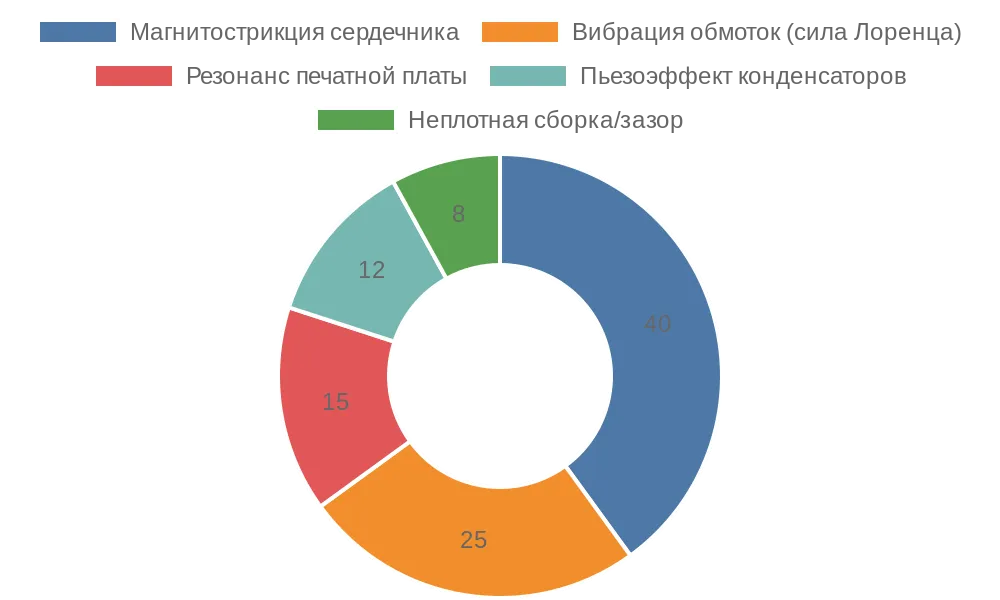 Основной вклад в акустический шум вносит магнитострикция, однако другие факторы, такие как вибрация обмоток и резонанс платы, также играют значительную роль.