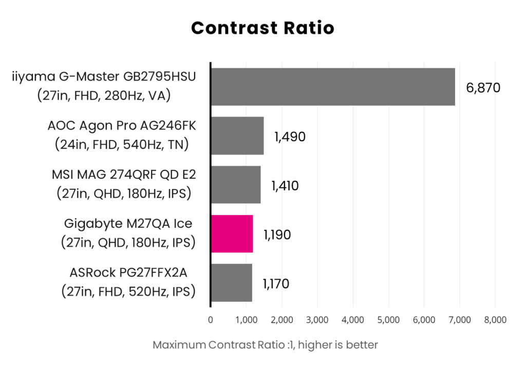 Контрастность на IPS-панелях уже целую вечность не поднимается выше ~1000:1. M27QA Ice не стал исключением, его максимальное соотношение составляет 1190:1.
