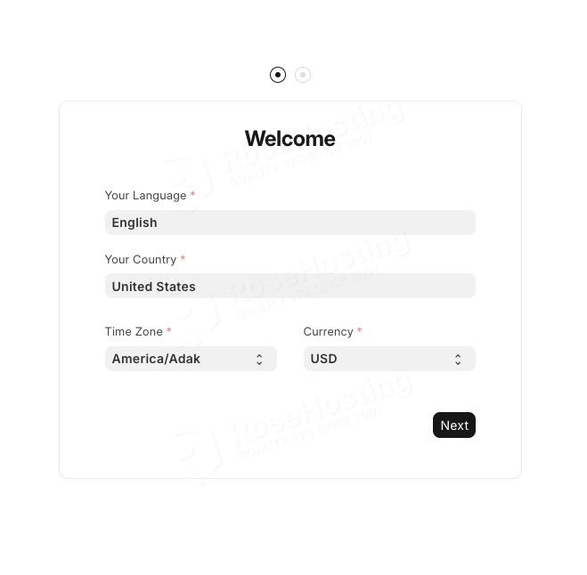 После входа в систему вам будет предложено настроить язык, часовой пояс, страну и валюту. Нажмите «Далее», чтобы продолжить.